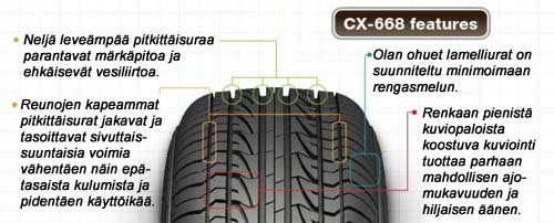 - Renkaan pienistä kuviopaloista koostuva kuviointi tuottaa parhaan mahdollisen ajomukavuuden ja hiljaisen äänen.